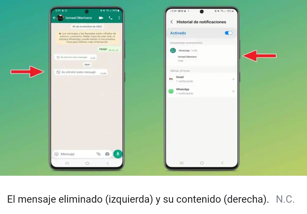 Una vez activada, en el caso de abrir WhatsApp y ver que algún contacto ha eliminado un mensaje, para saber qué decía basta con acudir al ‘Historial de notificaciones’ de los ‘Ajustes’ del teléfono para encontrarlo y averiguar su contenido.